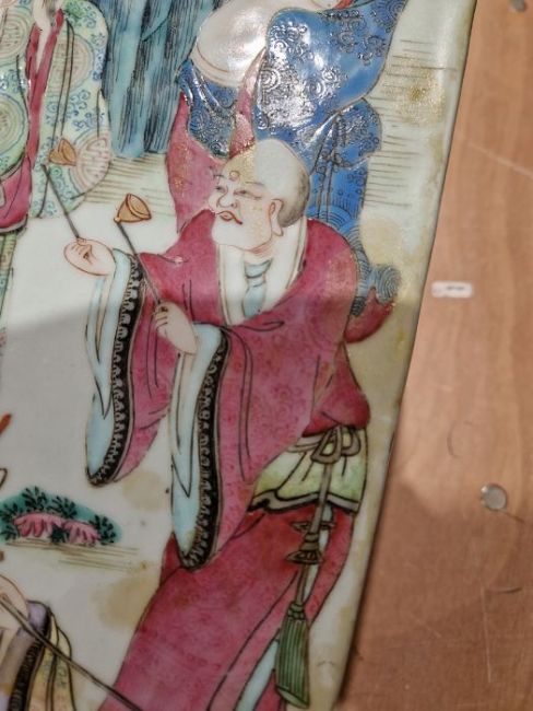 Pair Chinese porcelain tall vases of square tapering form, painted with figures in landscape in pink, yellow, blue and green, each with flared rim and pair lions mask and drop ring gilt handles, 59cm high (please see condition report and photos) (2)