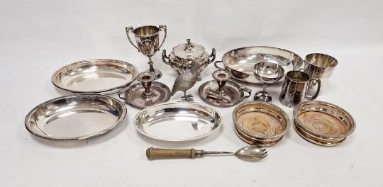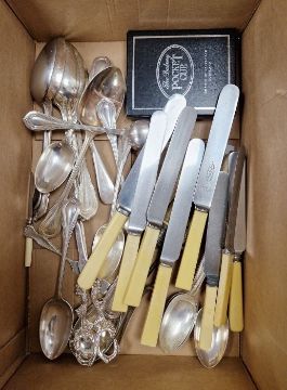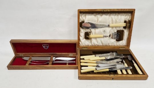 Gerber boxed carving set of knife and fork, pair of wine coasters with turned wood bases, pair chamber candlesticks with reeded borders, grape scissors, boxed flatware and other items (1 box and 1 canteen)