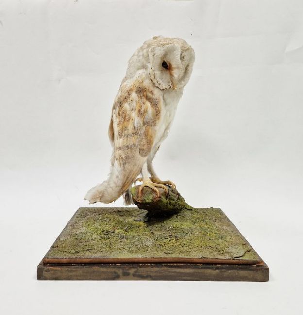 Rowland Ward Ltd, Piccadilly, London taxidermic barn owl under rectangular glazed display, with plinth base, 37cm high x 32cm wide approx.