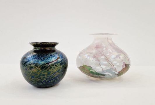 Isle of Wight iridescent glass vase, labelled to reverse, 11cm high and a Royal Brierley iridescent vase, marked to base, 9.5cm high (2)