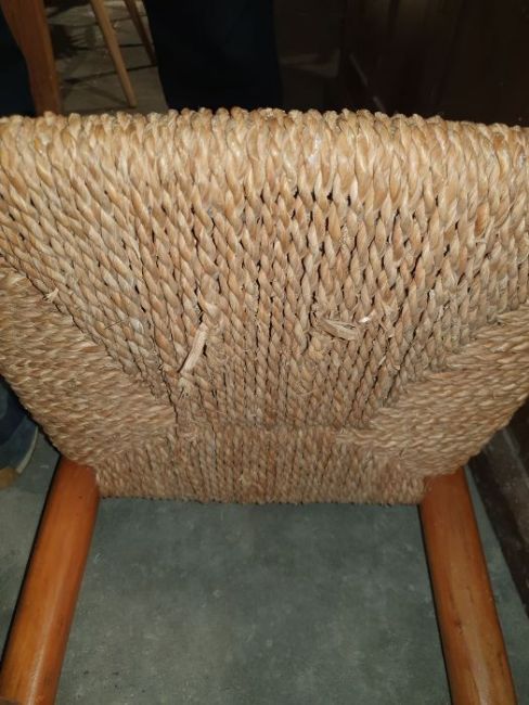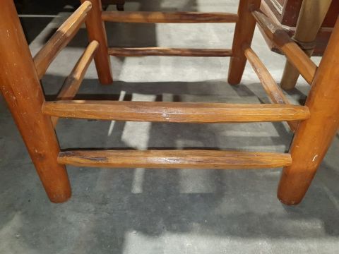 Possibly early/mid 20th Century. Surface scratches, scuffs, knocks and some minor splits to the wood. Wear and fraying in some areas on the rush seats. Accretions, spots of white paint, fading and discolouration. General wear and tear