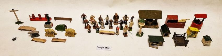 Britains model farmers and farmhands, sets of farmyard items, beehive, well, rabbit hut, etc and link hurdles (3 bags and a tin trunk)