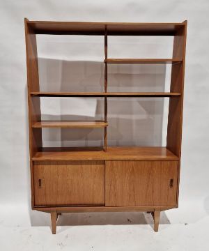 20th century teak wall unit with shelves above sliding doors, on tapering supports Condition ReportSurface scratches, scuffs and knocks. Areas of fading, discolouration and staining. Water spots to the cupboard doors and legs. Legs are sturdy and door open freely. General wear and tear. H. 174 x W. 122 x D. 30cm