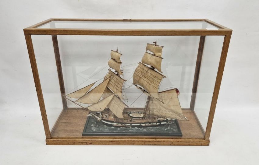 Model of the training brig 'Martin' by T.M. Devitt, with lifeboat, small figures of sailors, in glazed cabinet, 68cm wide x 49cm high