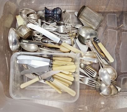 EPNS three-piece tea service, hexagonal, two-handled fruit bowl, EPNS bread stand with wooden bread board and a quantity of sundry plate (1 box)