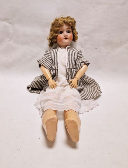 Schoenau & Hoffmeister bisque headed doll, 1909 to reverse of head, brown sleeping eyes, open mouth, composition body, 58.5cm