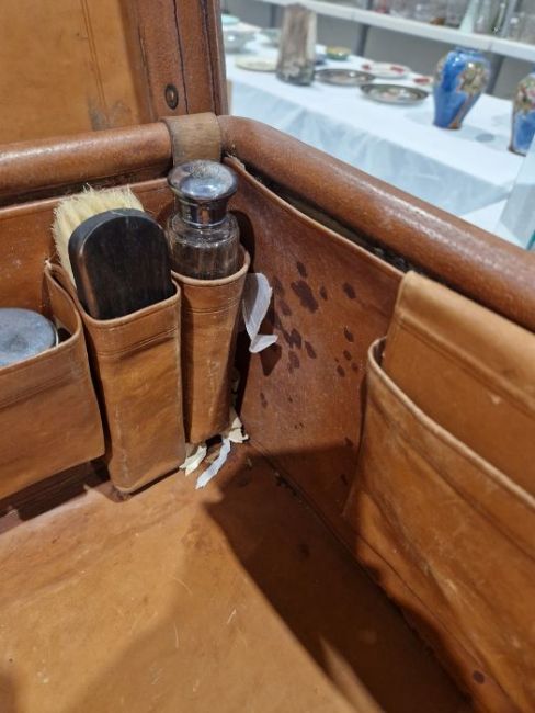 Large leather suitcase with part fitted interior of bottles, brushes, mirrors, etc, with name plaque 'W. Melville Wills, Leigh Woods, Bristol (1861-1941)' (Benefactor of Bristol and heir to Wills (Imperial) Tobacco Company), 66cm x 44cm x 26cm
