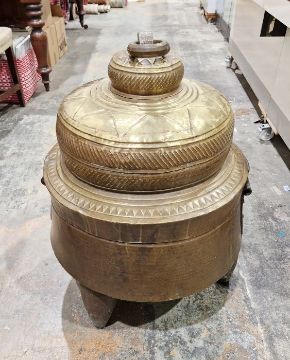 Indian brass temple brazier, circular with star design to the top, having ring handle to the cover, iron hinge to the hammered base, on three pointed feet, possibly Guduraji, 84cm high x 59cm diameter approx.