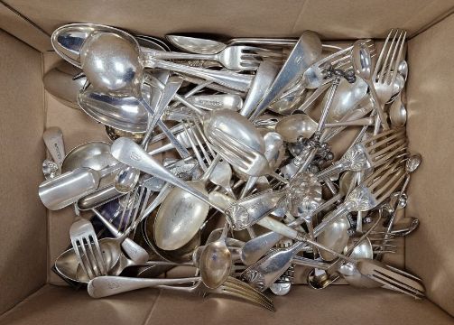 EPNS teapot, pair crumb scoops, flatware, etc (1 box)