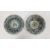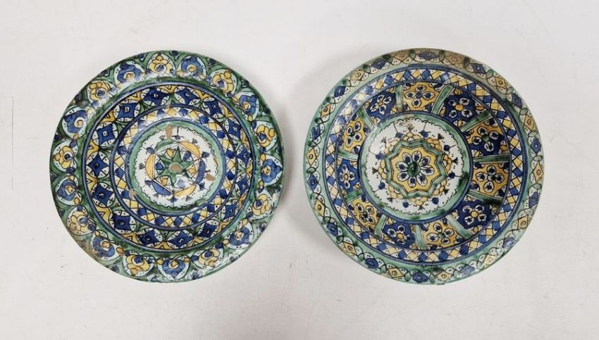 Pair of antique continental tin-glazed earthenware shallow dishes with geometric decoration in yellow, blue and green, 25cm diameter