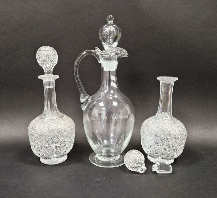 Pair of late 19th/early 20th century cut glass decanters, 30cm high (one stopper broken) and a 20th century glass decanter, 37cm high (3)