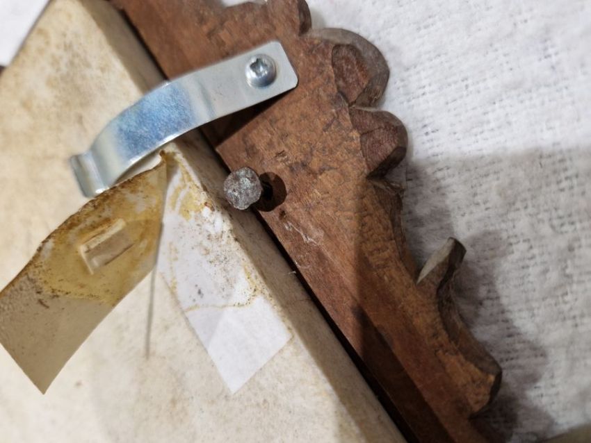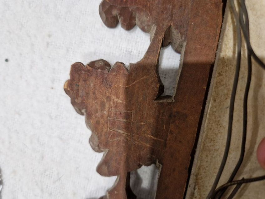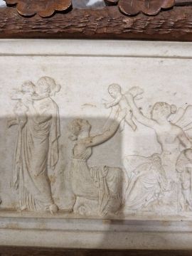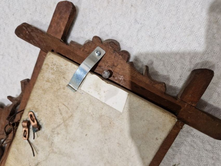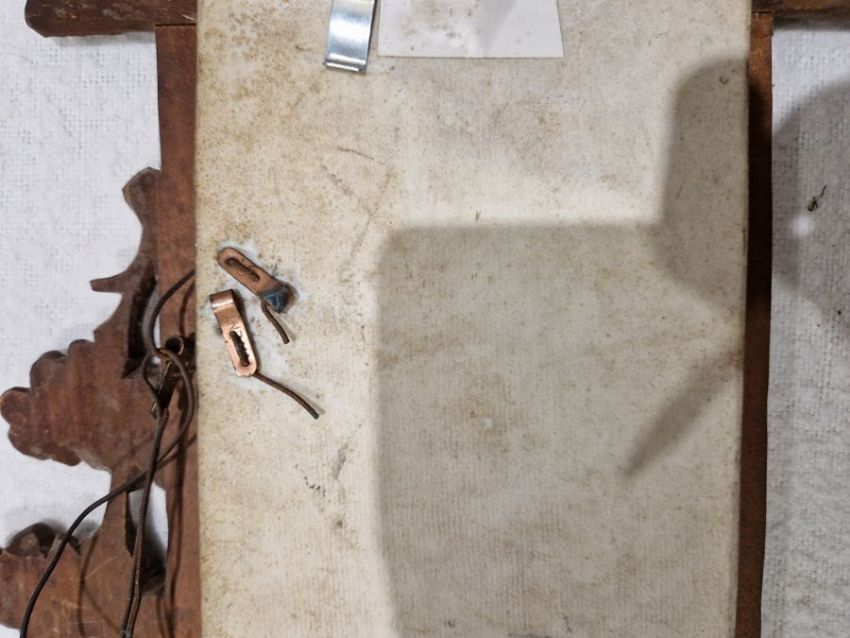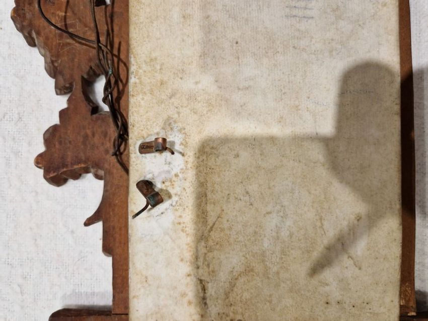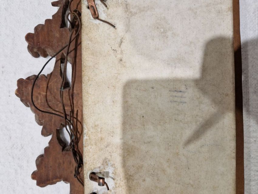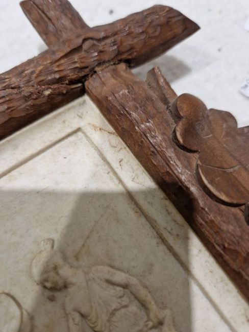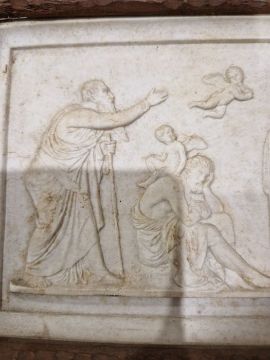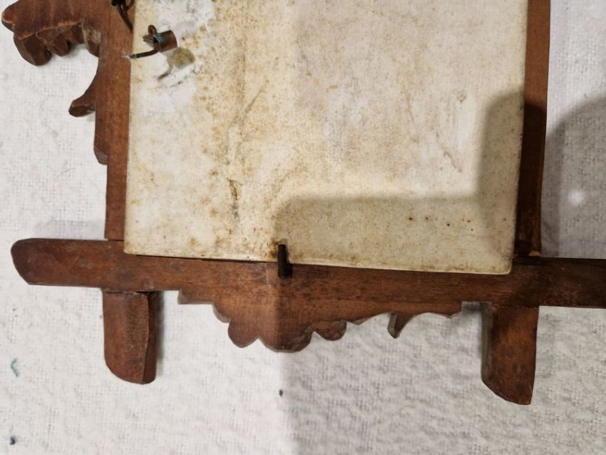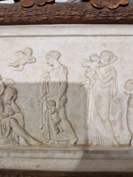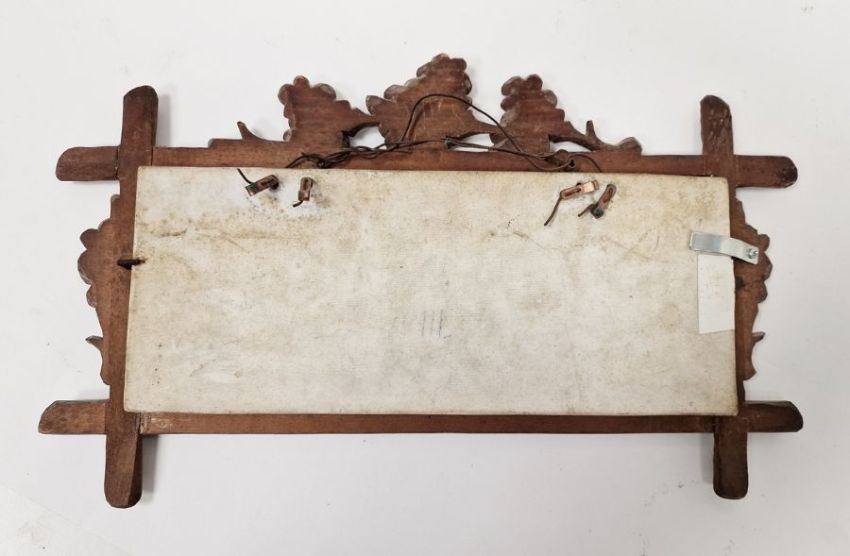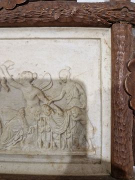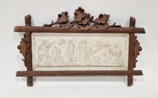 Plaque with light surface scratches, accretions and build up of dirt/dust. Scuffs and knocks to the wooden frame. Loose in frame and modern bracket added to back. General wear and tear.