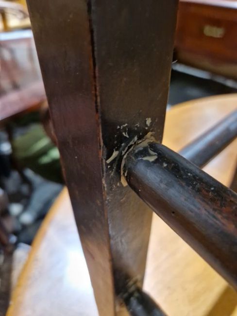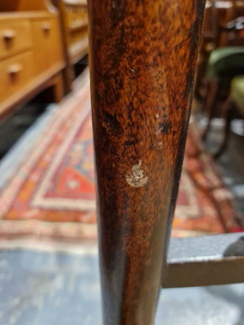 Surface scratches, scuffs and knocks to all. Old repairs to two chairs, areas of loss and chips to some, splits to the wood on some chairs. Section of stretcher missing on one. Fading and discolouration to all. General wear and tear.