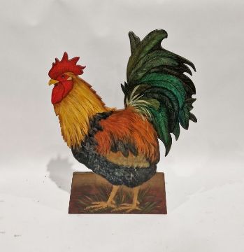 Carved and painted cockerel, probably used as a firescreen, signed on the back 'A. Churchill', 82cm high x 67cm widest part