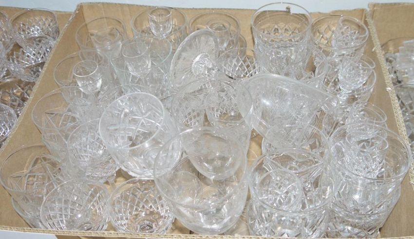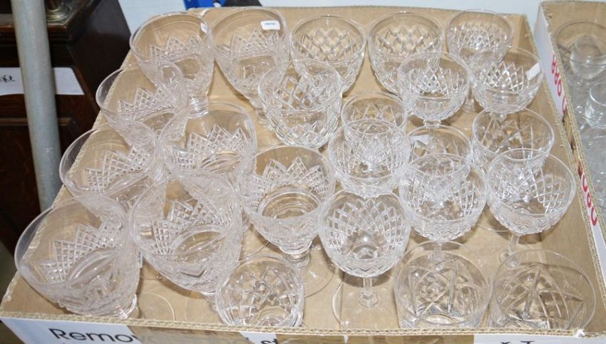 Suite of cut glass to include wines, sherries, tumblers, liqueurs and assorted other glasses to include engraved, Bristol blue coloured jug, various decanters, red overlay decanter (lacking stopper), assorted stoppers (4 boxes)