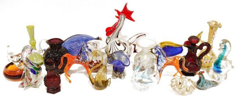 Various Murano-style glass animals to include cockerel, fish, horses, swan, duck, pig and small swan, bird, Metasequoia glyptostroboides, a collection of eggcups, a pressed glass plate 'Give Us Our Daily Bread', carnival glass, Art Deco green glass dressing table set, two glass elephants and assorted other ceramics (3 boxes)