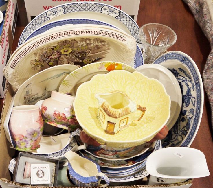 Quantity of assorted Carlton ware to include Carltonware, Wedgwood, Midwinter 'Riviera' a single plate, blue and white, Leonard vase, various vases, jugs planters etc (2 boxes)