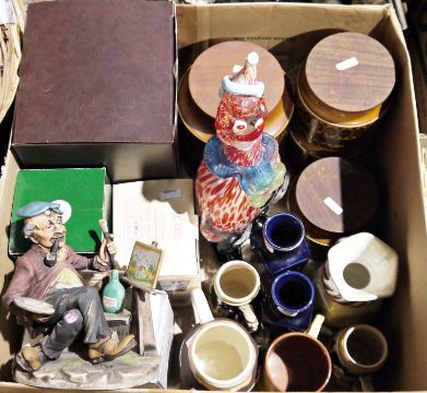 Quantity of assorted models of birds from the Chancery Collection by Maruri to include kingfisher, woodpecker, goldfinch, various models of dogs to include bull terriers, bull dogs, dachshunds, a Royal Albert 'Rebecca' puddle duck, figures of clowns to include a Murano glass style clown, steins,  Hornsea storage jars, etc. and two figures of elderly gentleman, one carrying baskets of fish, the other with a shotgun and hound (5 boxes and the 2 figures)