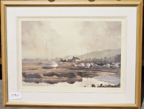 Estuary scene with boats on the flats and cottage in background, signed in the margin, studio blindstamp lower left, framed and glazed