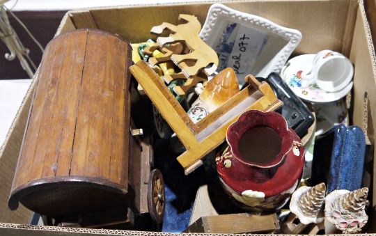 Carved wooden gypsy caravan with pair of horses, a bowl of ceramic fruit, assorted ornaments, a large ceramic model of a Siamese cat, a resin model of a cat, casserole dishes, mixing bowls, etc (2 boxes)