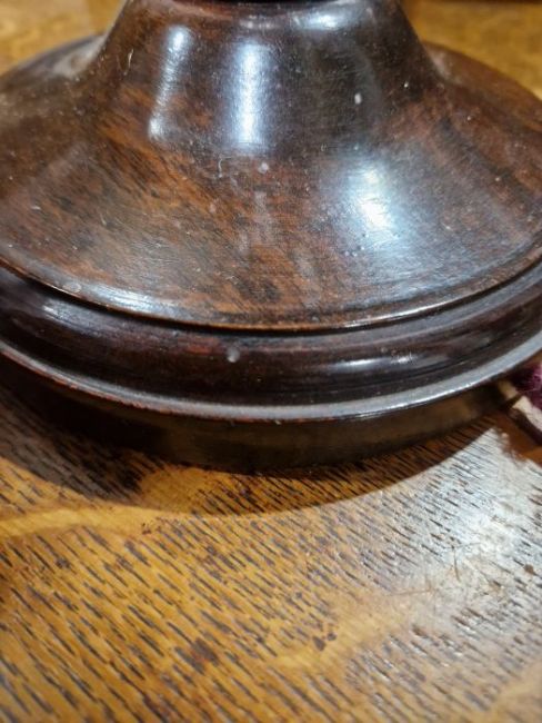 Pair of baluster lamps with surface scratches, scuffs and knocks to the wood. Split to the wood towards the base of one. Wires have been cut.