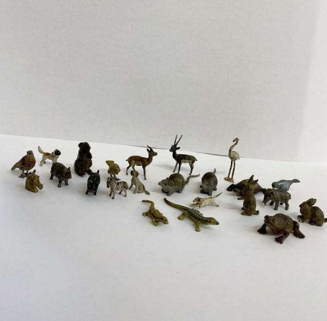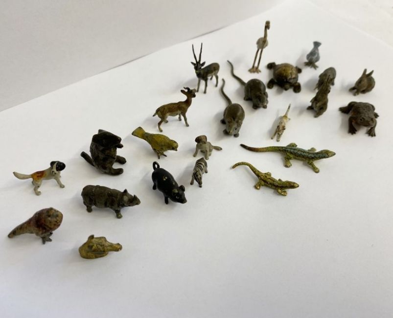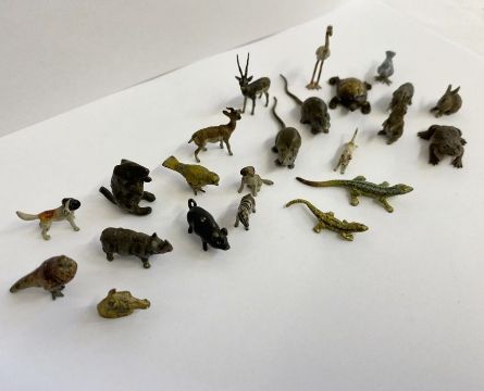 Quantity miniature cold painted bronze animals:-  rats, lizards, zebra, rabbits, flamingo, antelope, elephant, foxhounds, tortoise, birds, a horse's head, a rhinoceros, pig, toad, varying sizes in height from half a centimetre or less to 1cm