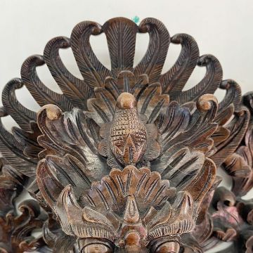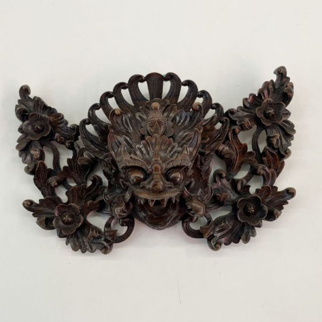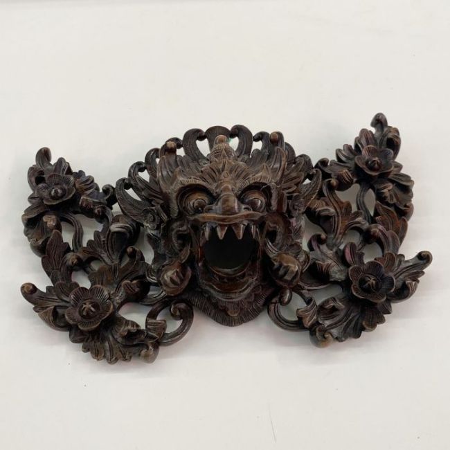 Chinese carved hardwood wall mask in the form of a grotesque Qilin, having carved feather and foliage pierced surround, 16cm x 28cm