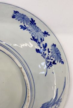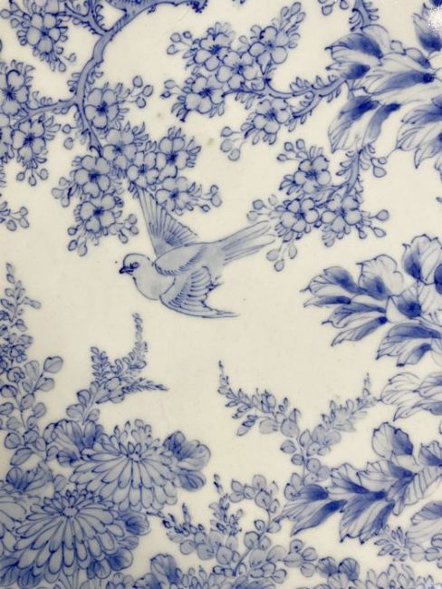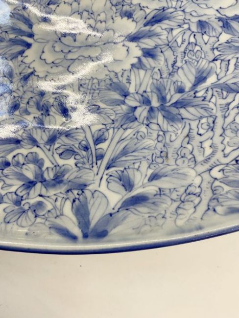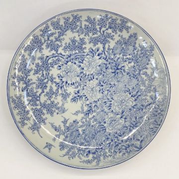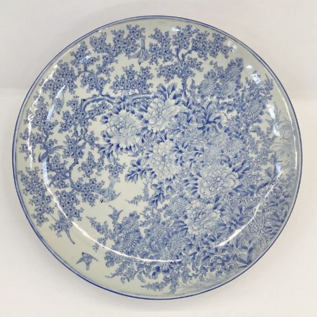 Japanese blue and white porcelain charger painted in underglaze blue with allover peonies, chrysanthemums and flowering branches and birds, 61cm diameter, with large black wooden plate stand