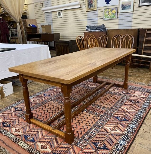 Stewart Linford elm and yew refectory table, rectangular with turned supports and double cross stretchers, 193cm long x 85cm wide x 72cm high, with receipt from Stewart Linford, Great Missenden dated 1982Please note all furniture purchased must be collected by 4pm Friday 16th December