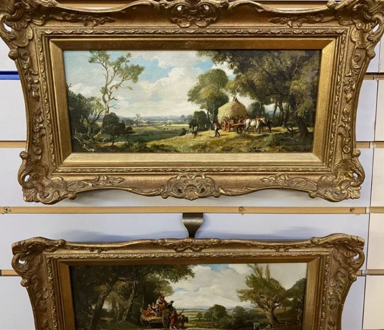 Unattributed Pair of 19th century oils on canvas Scenes of figures haymaking on hillside with horse-drawn hay carts, each 14cm x 34cm, framed (2)