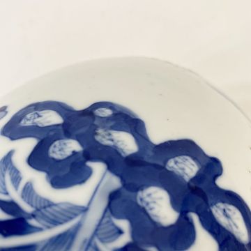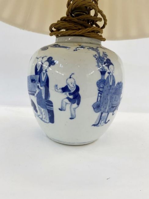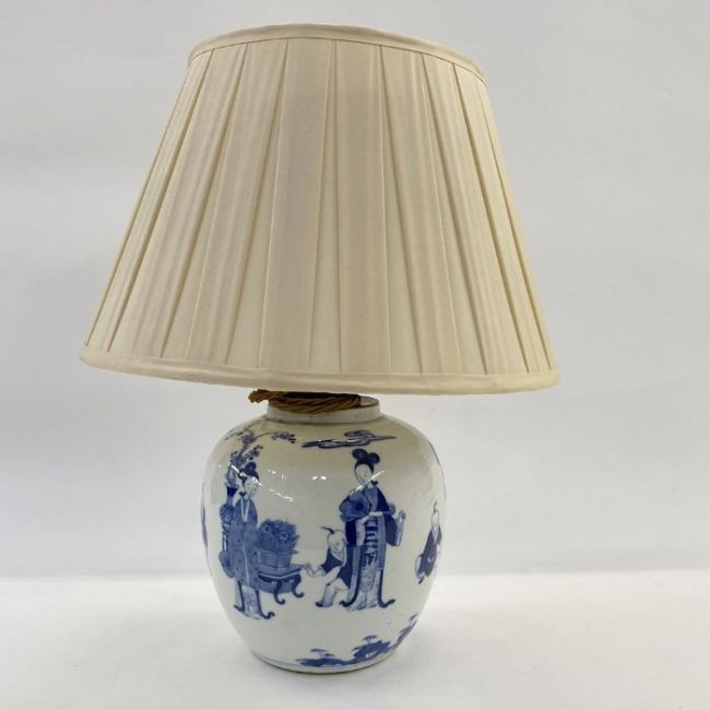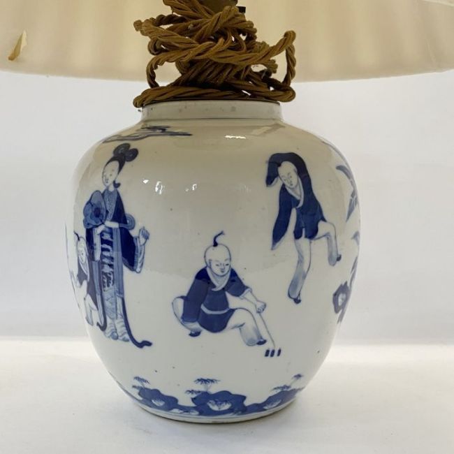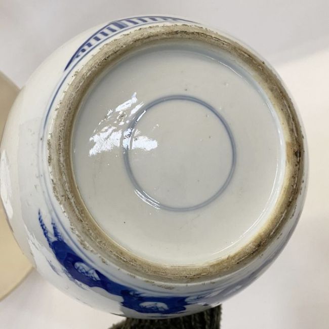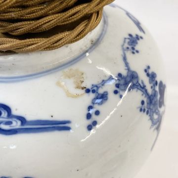 Occasional spots to the glaze; possible repair or firing fault to the bottom of the leafy plant, leaving a raised bump. Base a little worn; lamp will require fresh wiring and bulb. In need of a clean.