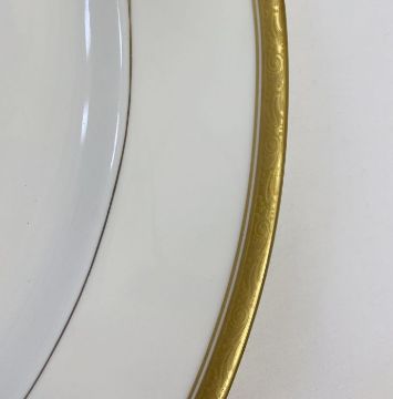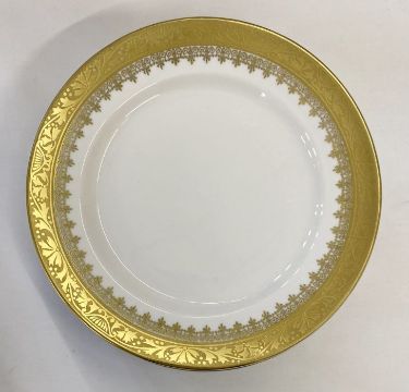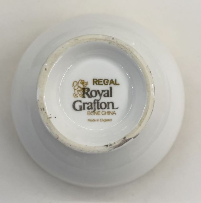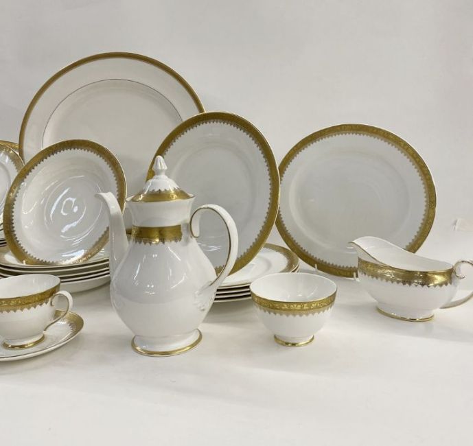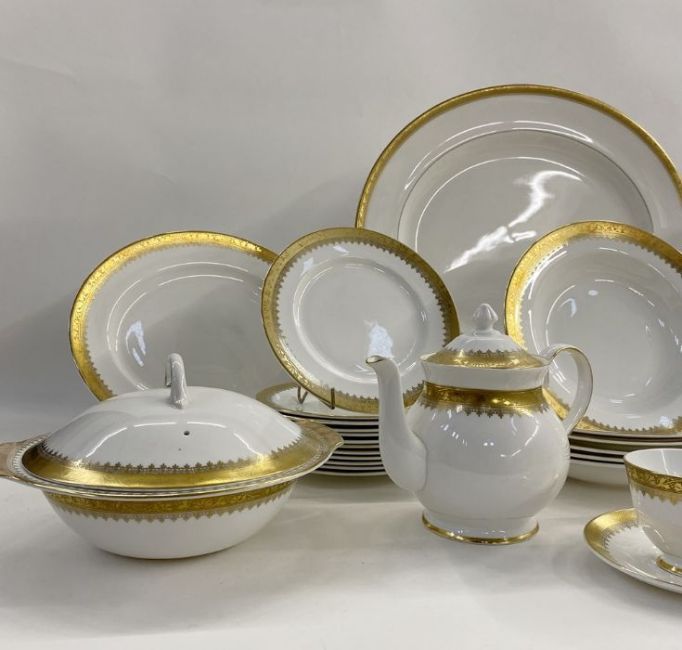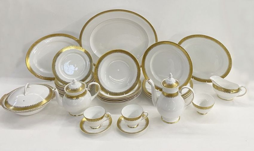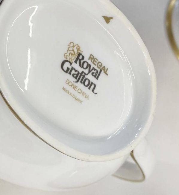 Royal Grafton 'Regal' pattern, part dinner service, gilt borders viz:- 12 dinner plates, 12 side plates, 12 medium plates, 12 saucers, 11 cups, 11 soup bowls, three covered  tureens, 2 sauce boat stands , 1 sauce boat, 2 meat plates, tea-pot, coffee pot and sugar bowl