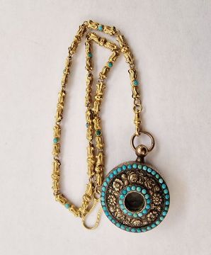 Externally appears to be in good condition commensurate with age; metals as described, possibly Pinckbeck, one small visible area of loss of gilt metal to edge of top casing and a few minor dents to deep reeded edge, glass clear but dusty and magnification limited, chain length 37.5cm, excluding both clasps