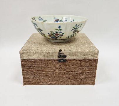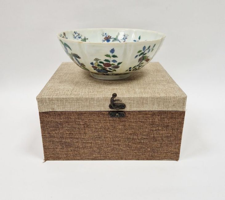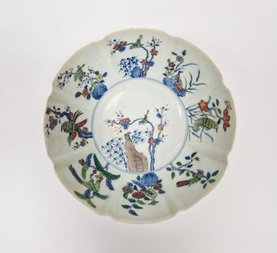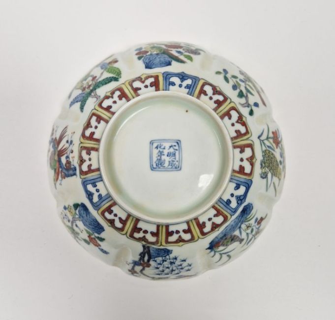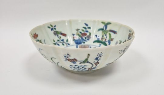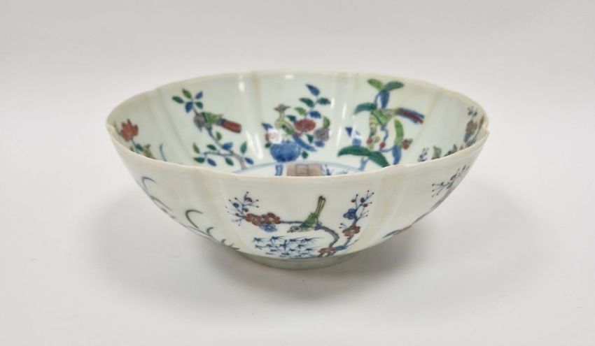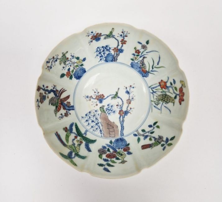 20th century Chinese porcelain bowl in Chenghua style, eight-lobed and painted with birds on branches, 20cm diameter