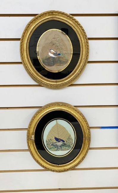 Pair of Chinese watercolours of exotic birds, each on a leaf-pattern ground and surrounded by foliage, oval, in verre eglomise and giltwood frame, 33cm x 28.5cm overall (including frame) Condition ReportThey come from a private home - a deceased estate, which was full of lovely things. We have no more information than that I am afraidplease see further images