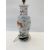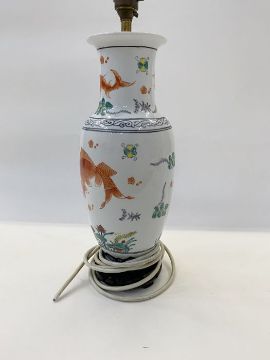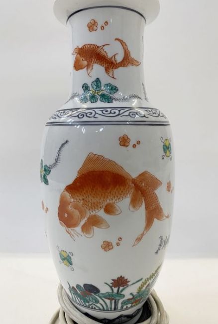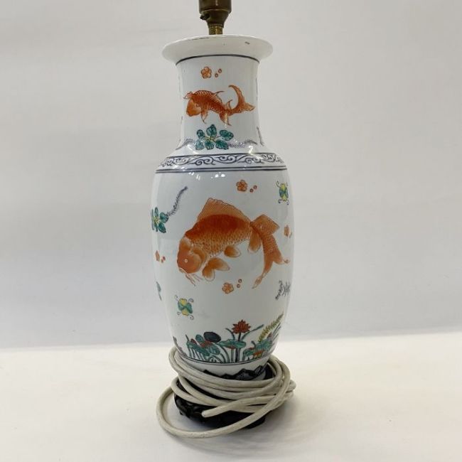 Chinese porcelain vase table lamp of slender ovoid form and painted with cart, in iron red amongst water lilies and seaweed, 32cm high