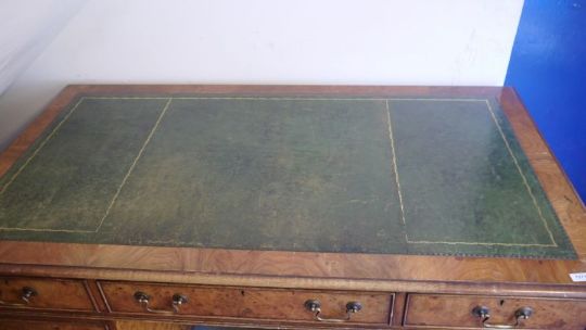Burr walnut veneer twin pedestal desk with gilt tooled leather top, having a central long drawer flanked by single drawer on each side, four further drawers and one filing drawer, 76cm high x 136cm wide x 76cm deep Condition ReportWear throughout including scratches, minor dents and edge wear. Less wear to back. Top fits very tightly. Please see attached pictures.