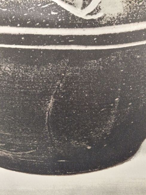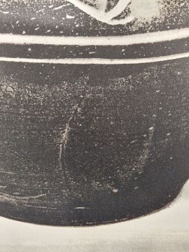 After Bernard Leach (1887-1979)Lithographic print 'Black Jar' printed at the Curwen Studios 1974signed in pencil lower right, limited edition number 7 of 100, mounted but unframed 77.5 x 57cmCondition ReportSome staining in places, browning to the edges. Stain above number and stain above vase. Pin holes to the corners. Possibly some fading/discolouration.  Biro mark and tape to the back General wear and tear.
