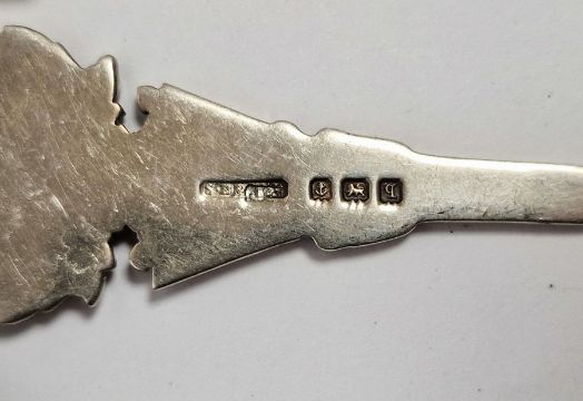 Assorted souvenir and apostle spoons, other spoons, silver and enamel badge 'Registered General Nurse Scotland', etc