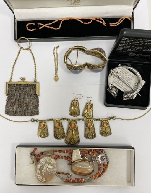 Chinese silver-gilt bangle, a beaded purse, a 9ct gold small padlock chain bracelet, 2g approx. and other costume jewellery