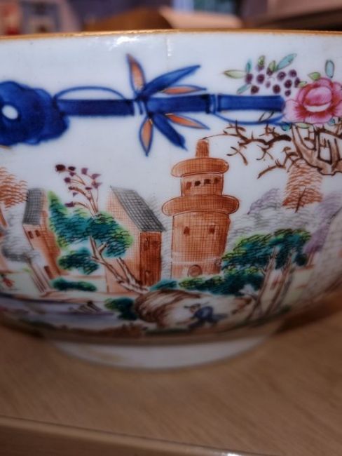 18th century Chinese-style porcelain punch bowl, the exterior painted with bamboo framed panels of European-style harbour with figures, blue brocade border, 29cm diameter