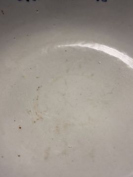 Crack through top rim, see additional photos. Small chip to the foot rim. Surface marks, wear and scratches visible throughout, commensurate with age and previous use.