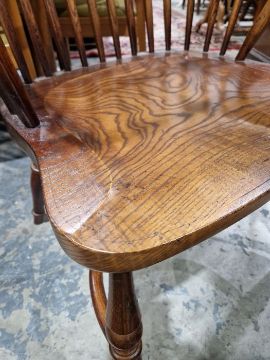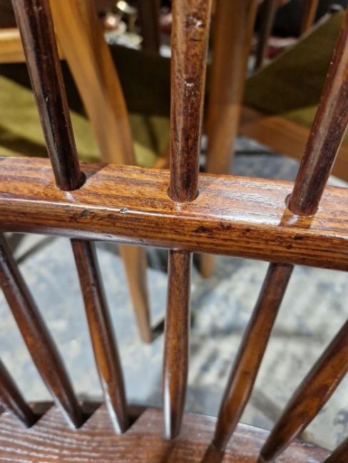 Chair appears to be 19th century. Surface scratches, scuffs and knocks, some fading and discolouration. Structurally solid. Wear to arms, no signs of worm. General wear and tear commensurate with age and use, see photos