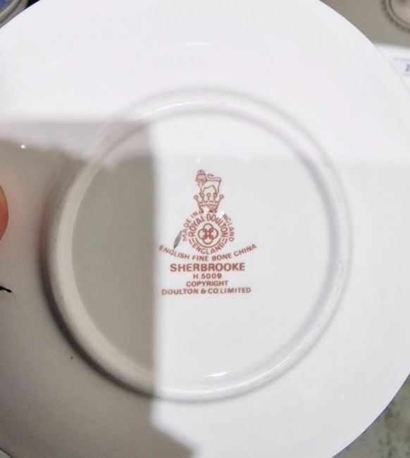 Royal Doulton 'Sherbrooke' pattern part dinner service to include dinner plates, side plates, lidded tureens, platter, teapot, cups & saucers, etc
