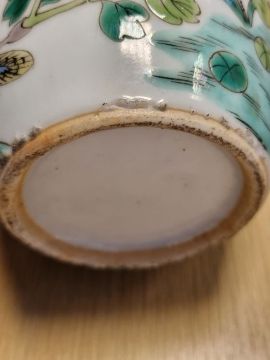 Foot rim of the bowl has numerous chips to it. Two previous breaks and repairs to the top rim. Small hairline crack to the rim of the jar. Chip to opposite side. Wear visible around the base. Bar the mentioned surface marks and wear visible in places commensurate with age and previous use.