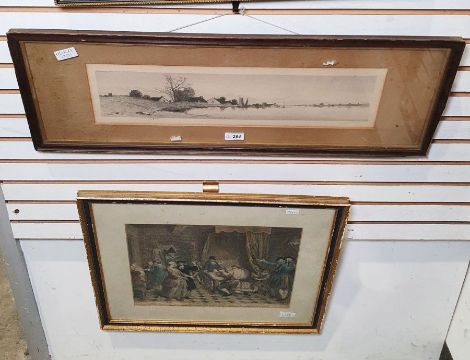 After E J Field Etching River scene, 10cm x 46cm After Louis De Surugue (1686-1762) Coloured engraving "Un Serrurier Coupe le Pot de Chambre pour Degager le Pied de Ragotin", 25cm x 35cm (2)