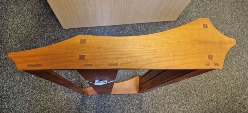 1970 Oliver Morel Cotswold School cherrywood wall rack, the top rail with scalloped edge, two plateracks, having shaped sides with visible tenon joints, 56.5cm x 108cm Condition ReportLight surface scratches, accretions and flecks of what appear to be white paint. Some minor scuffs. Some fading and discolouration. Splits near the screw holes at the back of the top tier on both sides, General wear and tear commensurate with age and use, see photos.