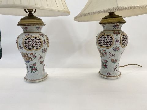 Pair Samson porcelain pseudo Chinese vases fitted as table lamps, each inverse baluster and having latticework piercing, allover floral decoration in famille rose colours, pseudo Chinese seal mark to base, 30cm high (2) Condition ReportOne Vase - Several large cracks/repairs to the top, several spots of wear and colour loss to bits, there is some wear to the grating, there is a crack to the baseOther vase - chip to the top, several cracks to the top, wear to the base and to sidesSee attached images
