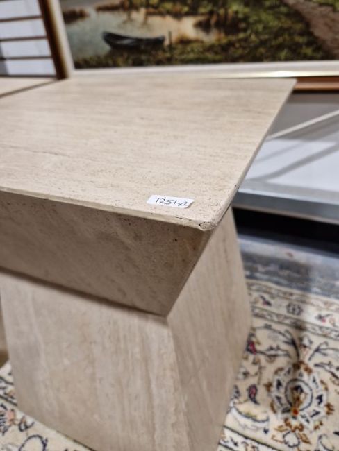 Pair of 1980's Travitine angled post-modern side tables, each 49cm high x 40cm wide x 40cm deep approx.