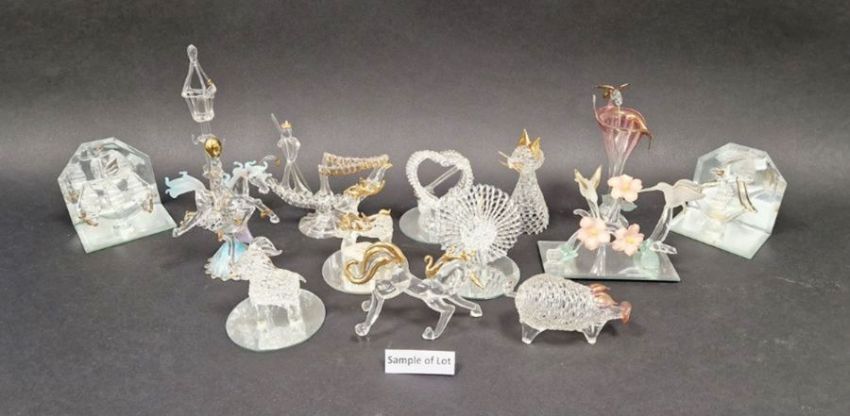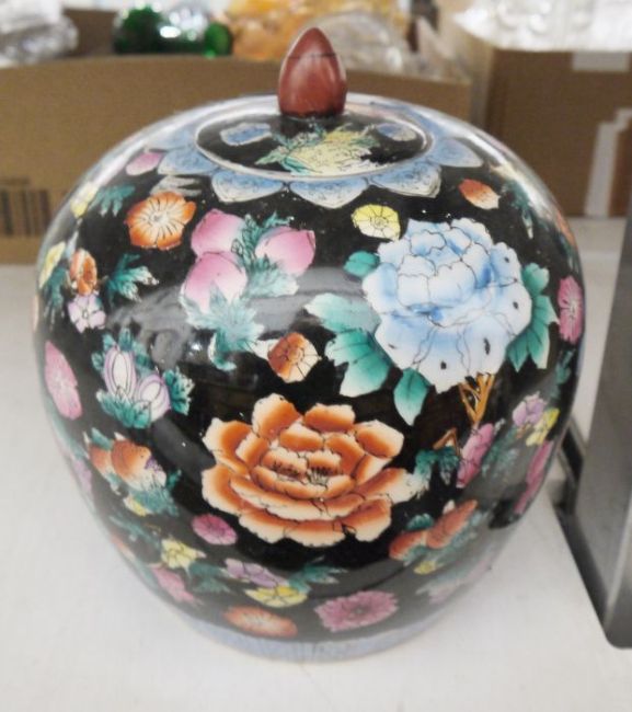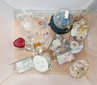 Quantity of lattice and filigree glass animals and ornaments, a Leonardo collection of Chinese style glass, faux wood plants and a ginger jar, black ground, orange and blue peonies, etc